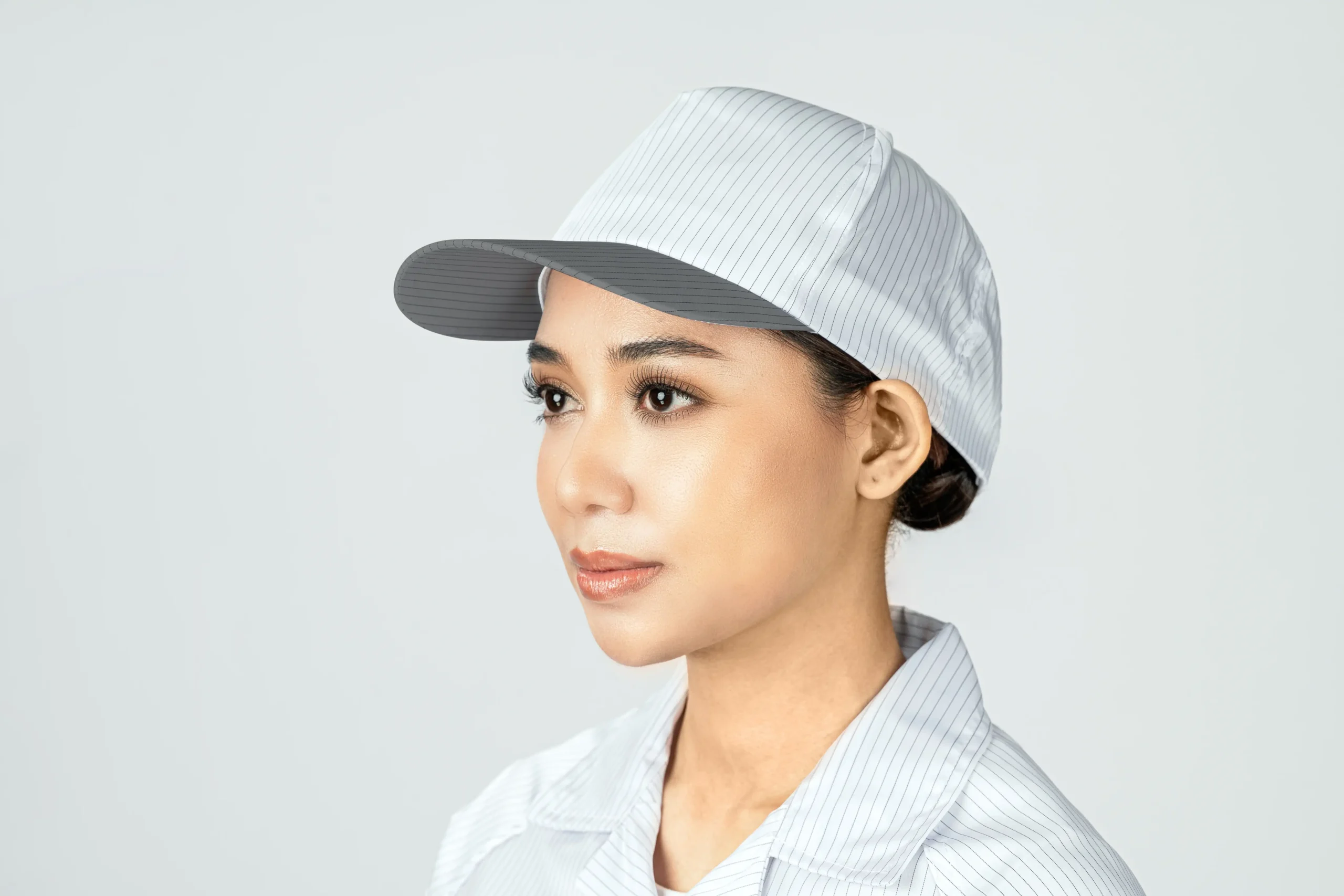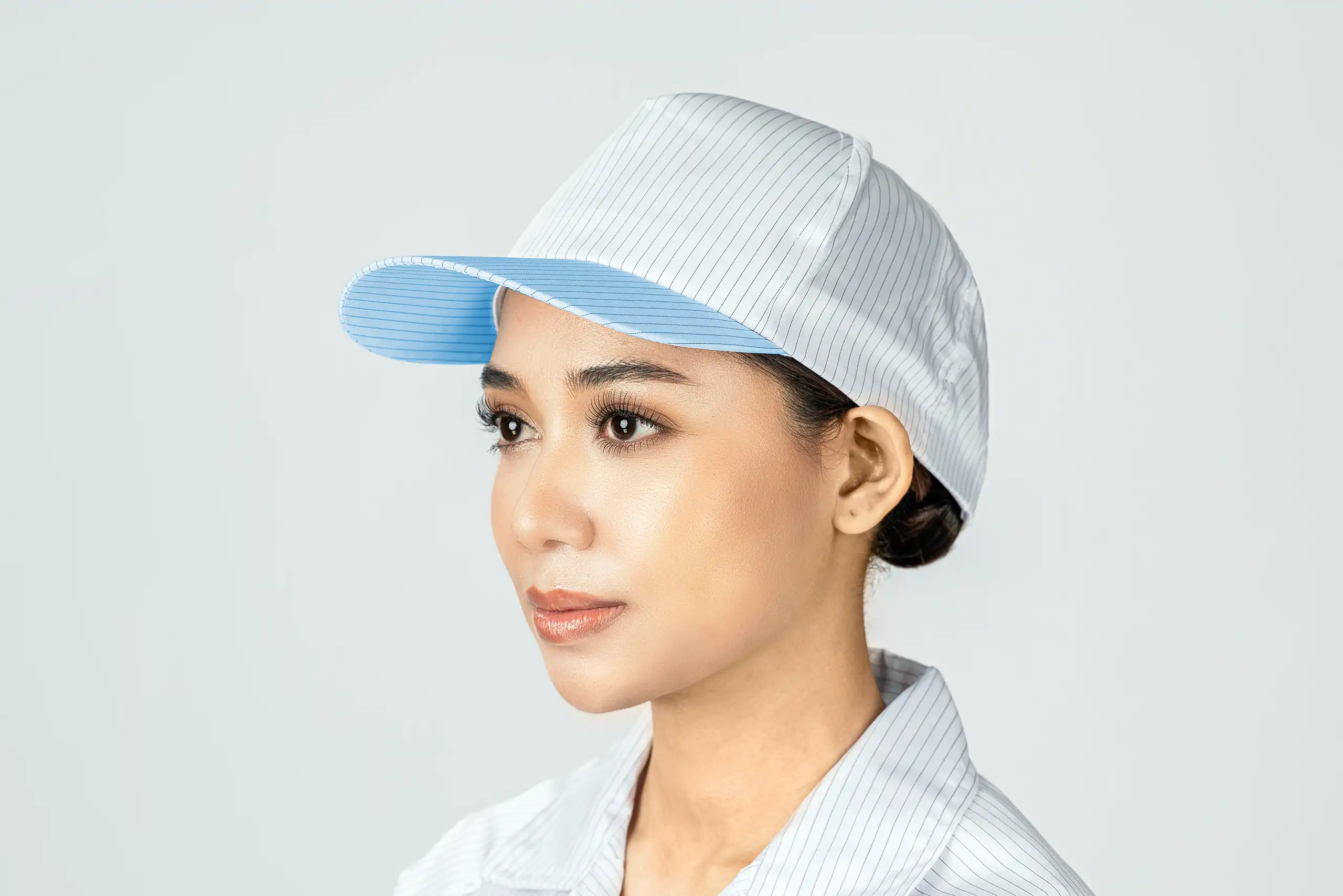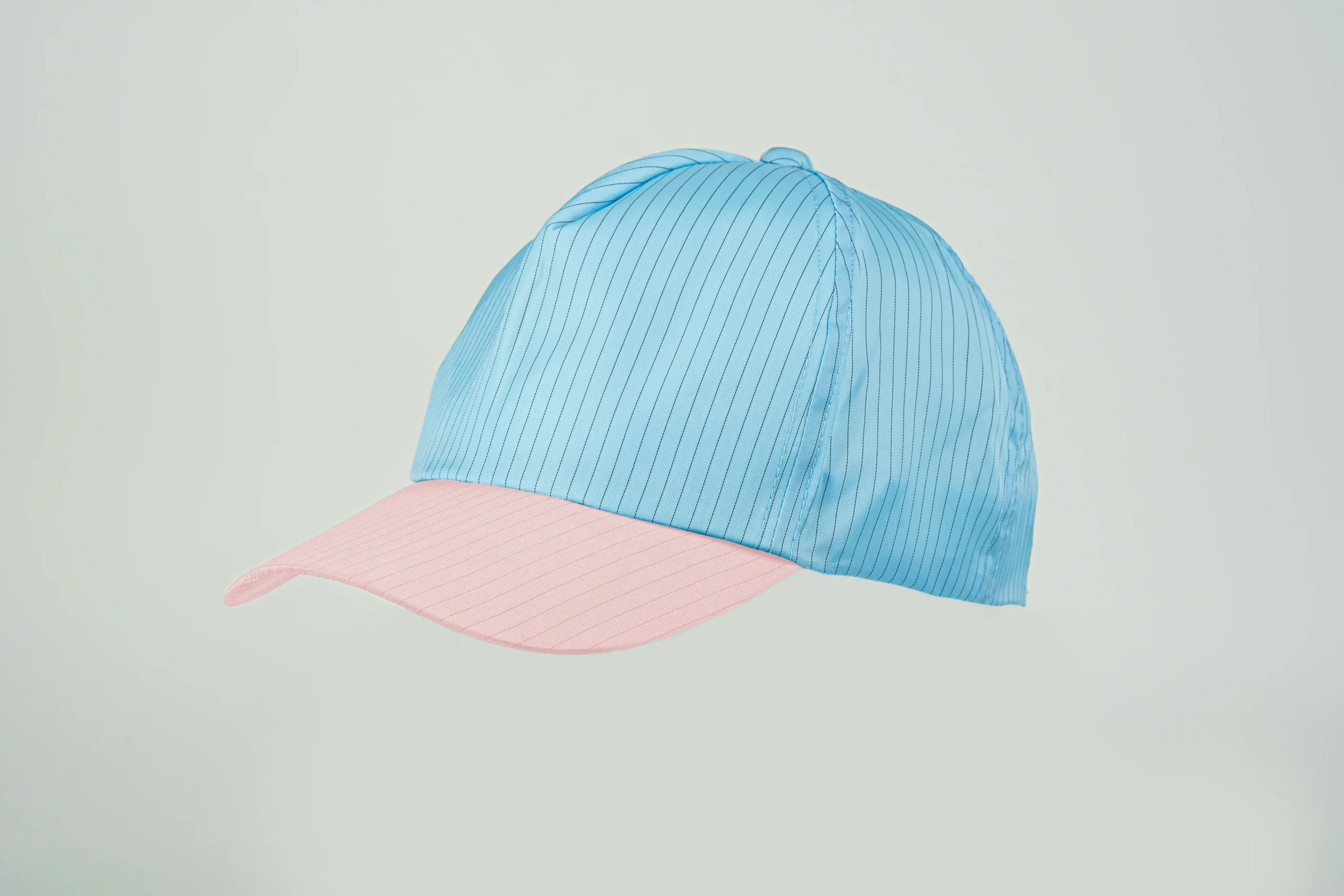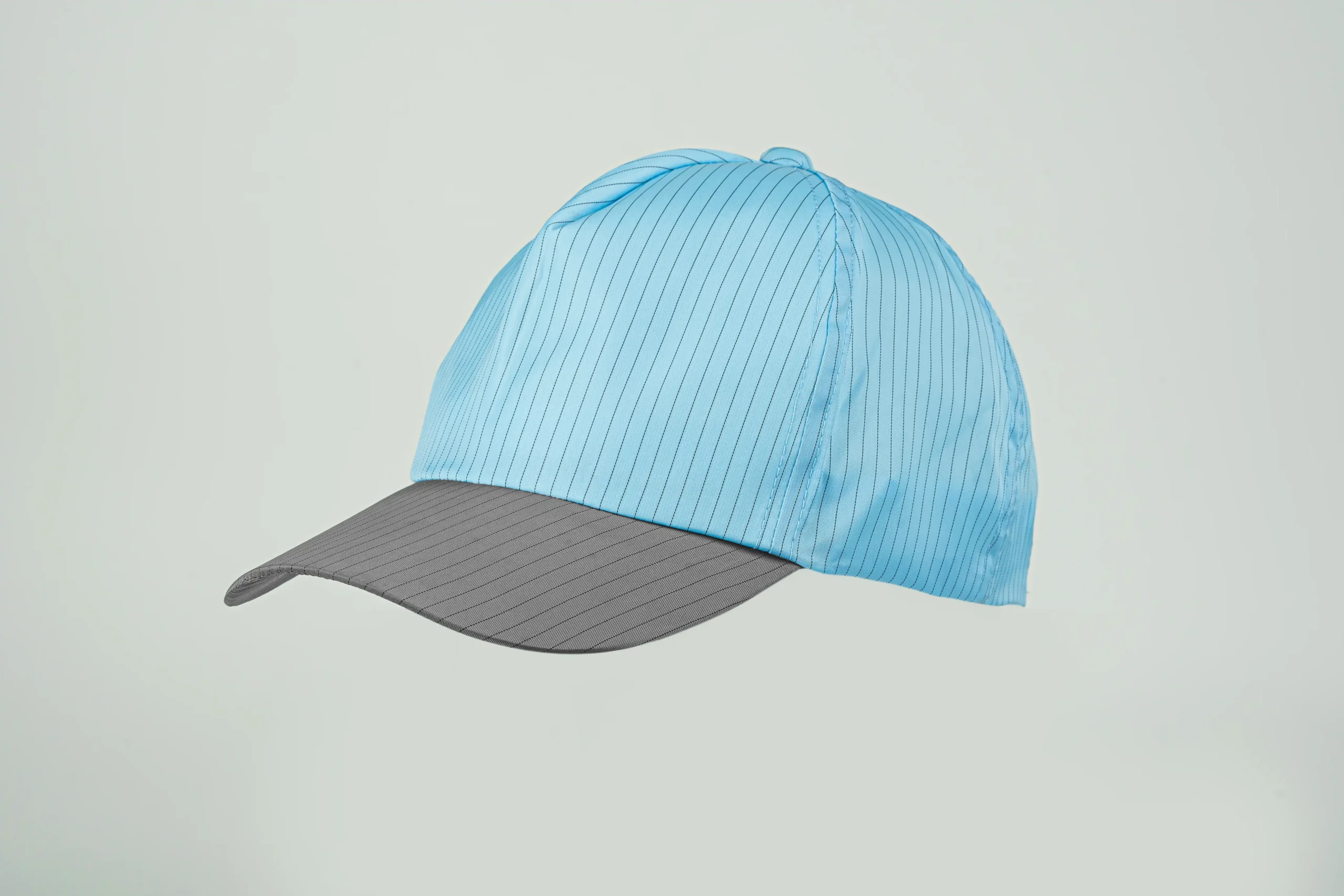 This cap has a classic baseball cap shape with a curved brim and a two-color design for a sharp, clean look. It features an adjustable strap at the back for a snug, comfy fi t and is made from breathable, lightweight material with fi ne conductive stripes that help control static.