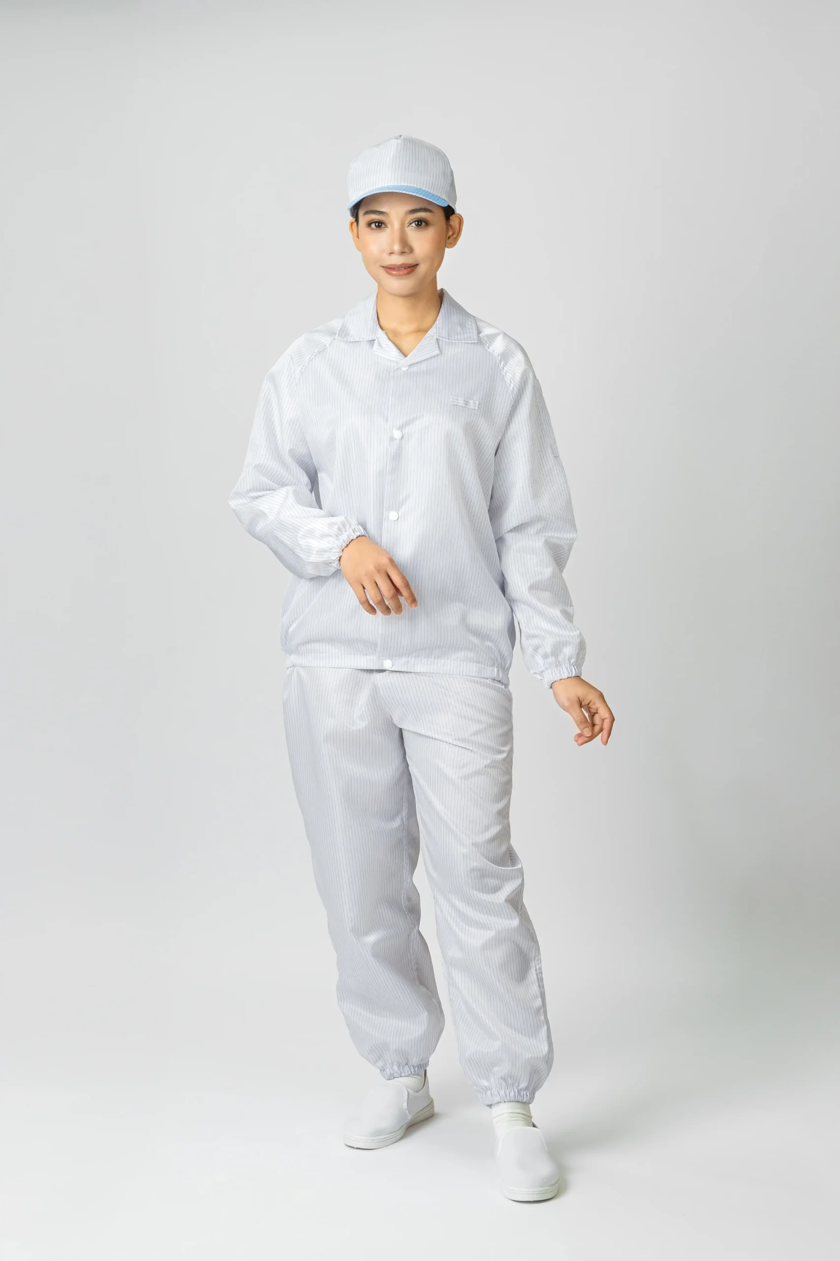 Made from special antistatic fabric — 99% polyester and 1% carbon fi ber — to safely discharge static and reduce contamination.