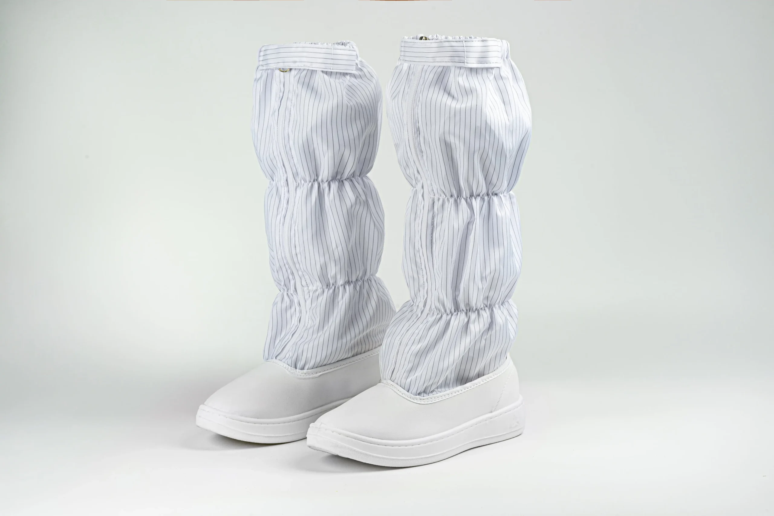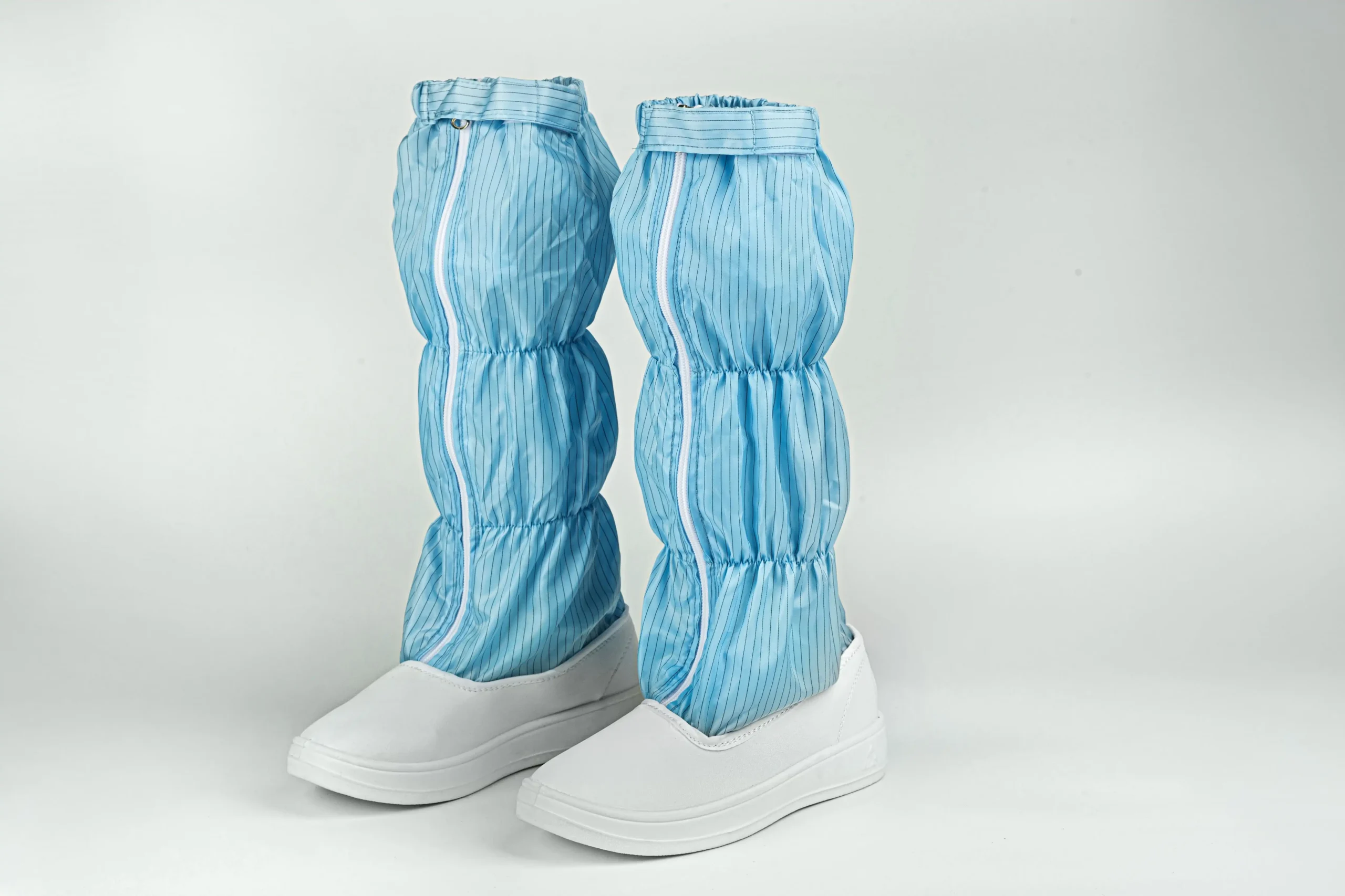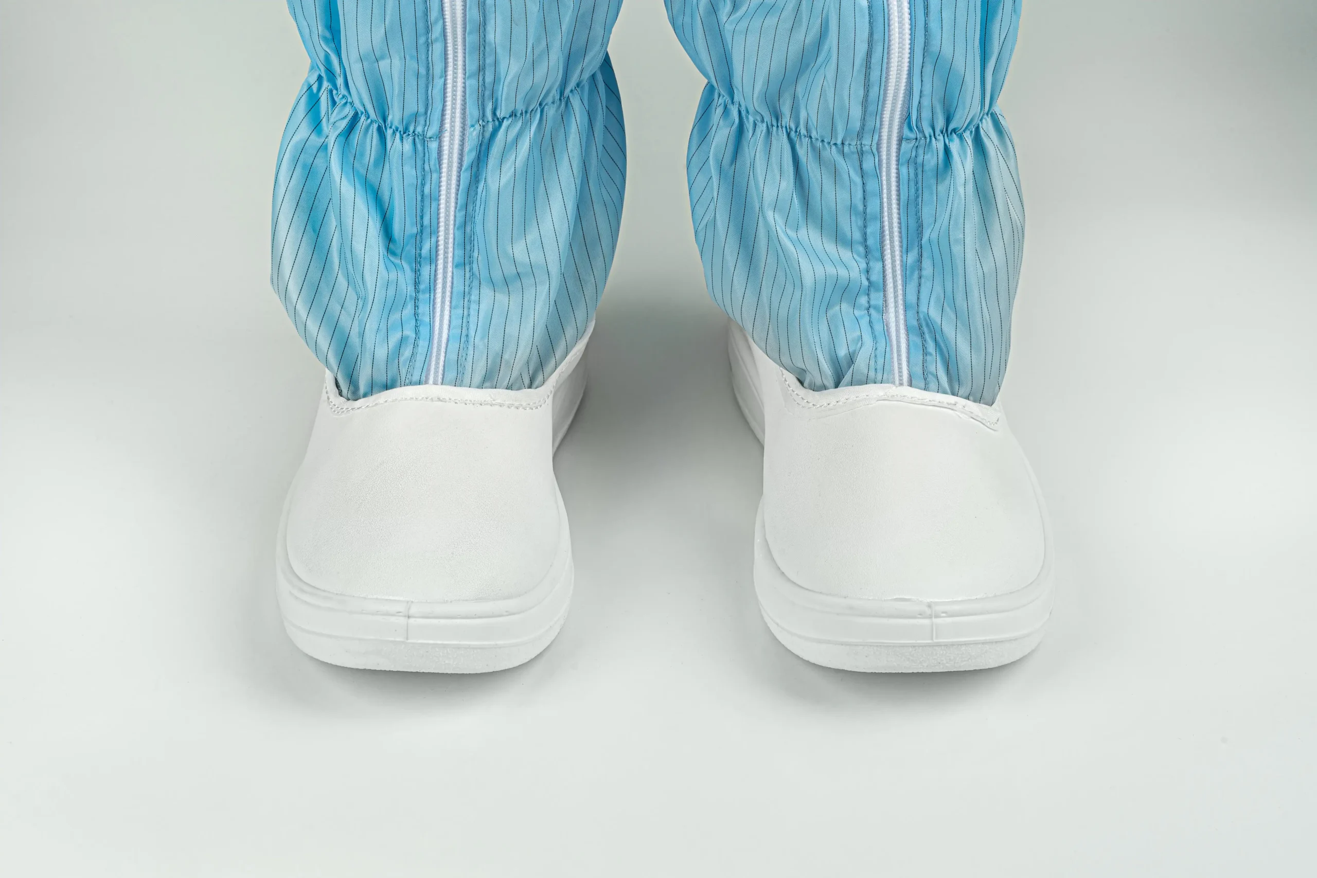 These boots are crafted with a durable PVC front sole seamlessly joined with anti-static fabric to ensure secure bonding and flexibility. A front zipper allows for easy wear and removal, while a secure locking system prevents accidental opening during movement. The high tube design offers enhanced coverage and support for high-standard cleanroom work.
