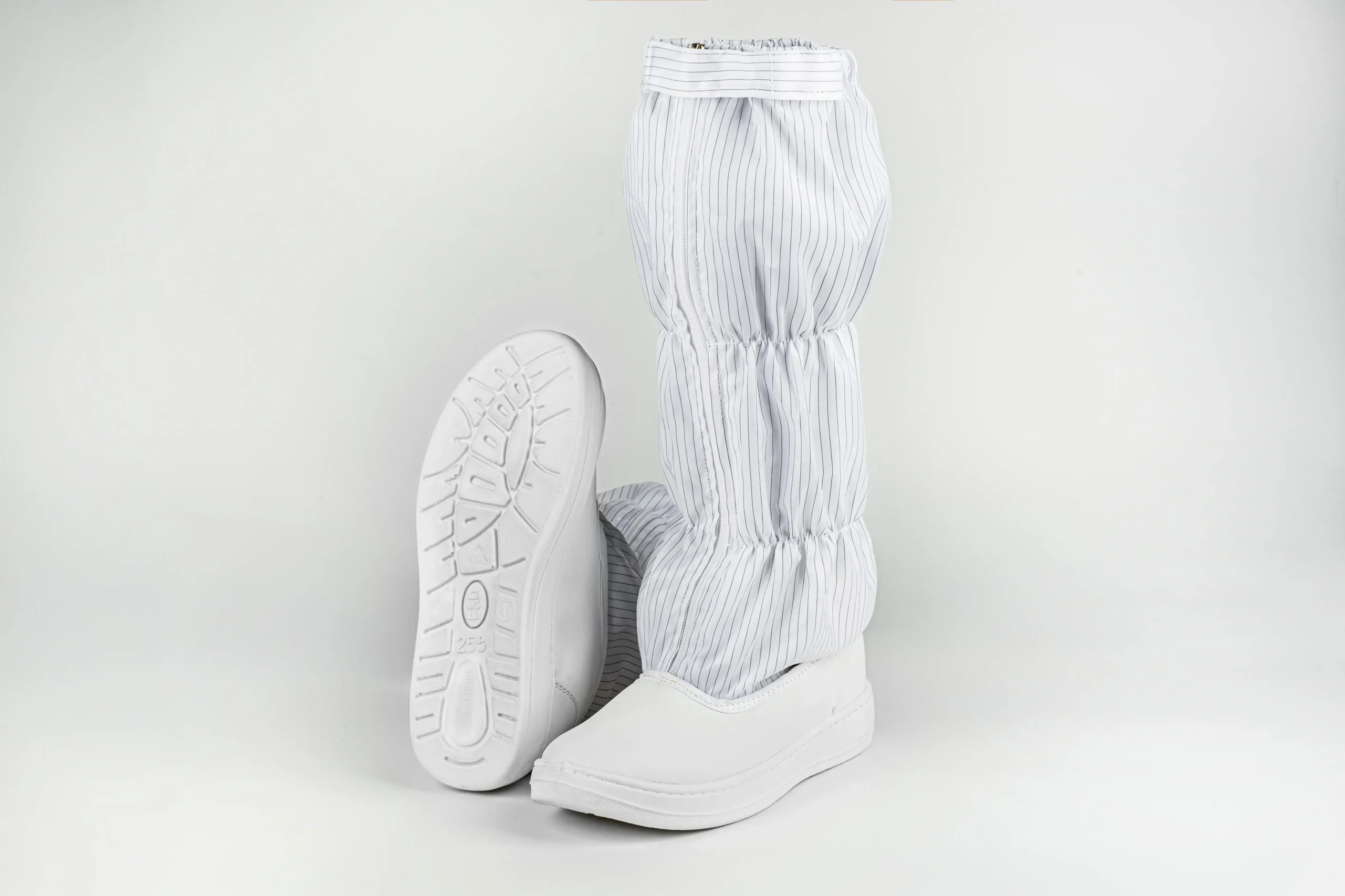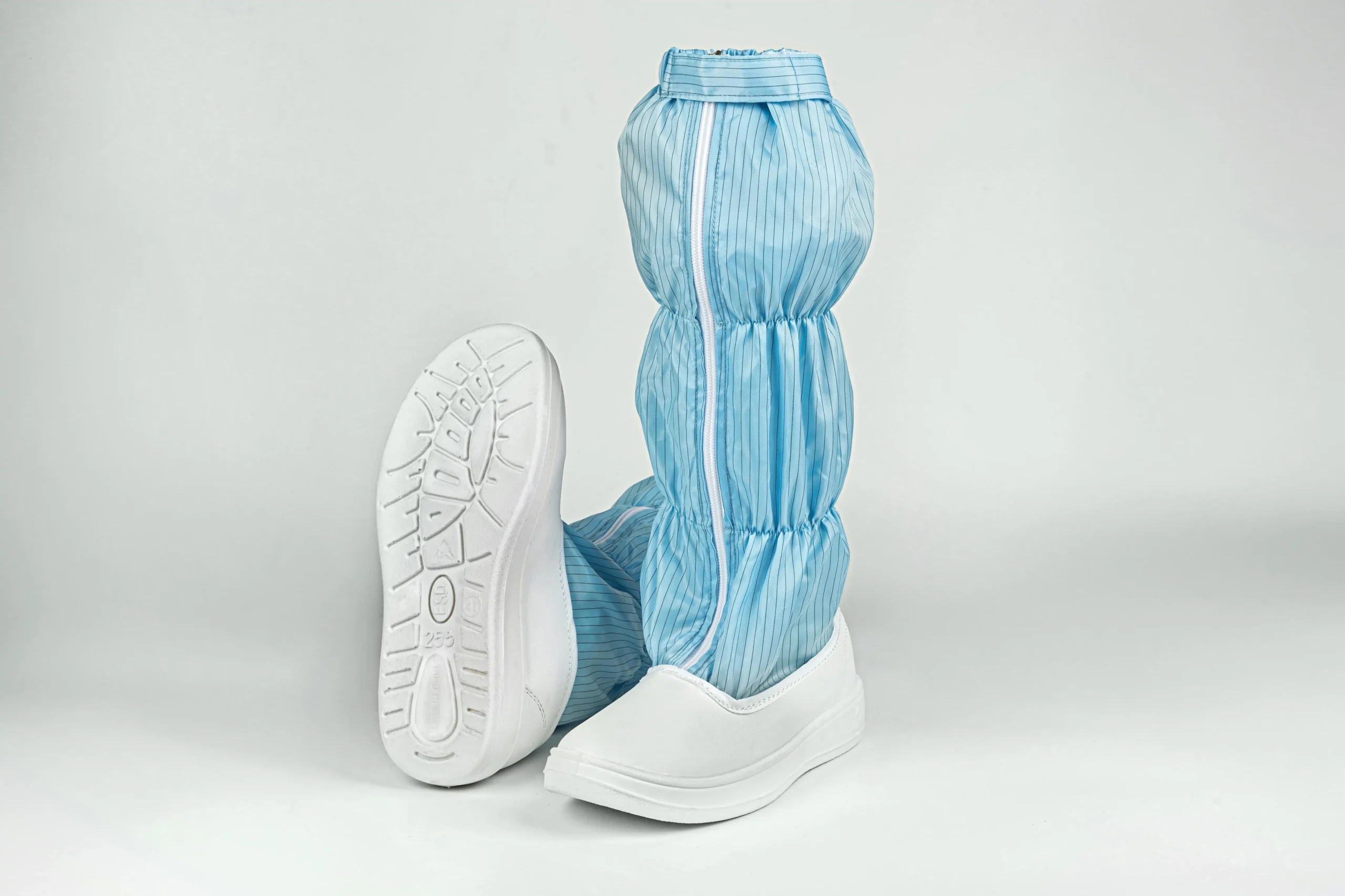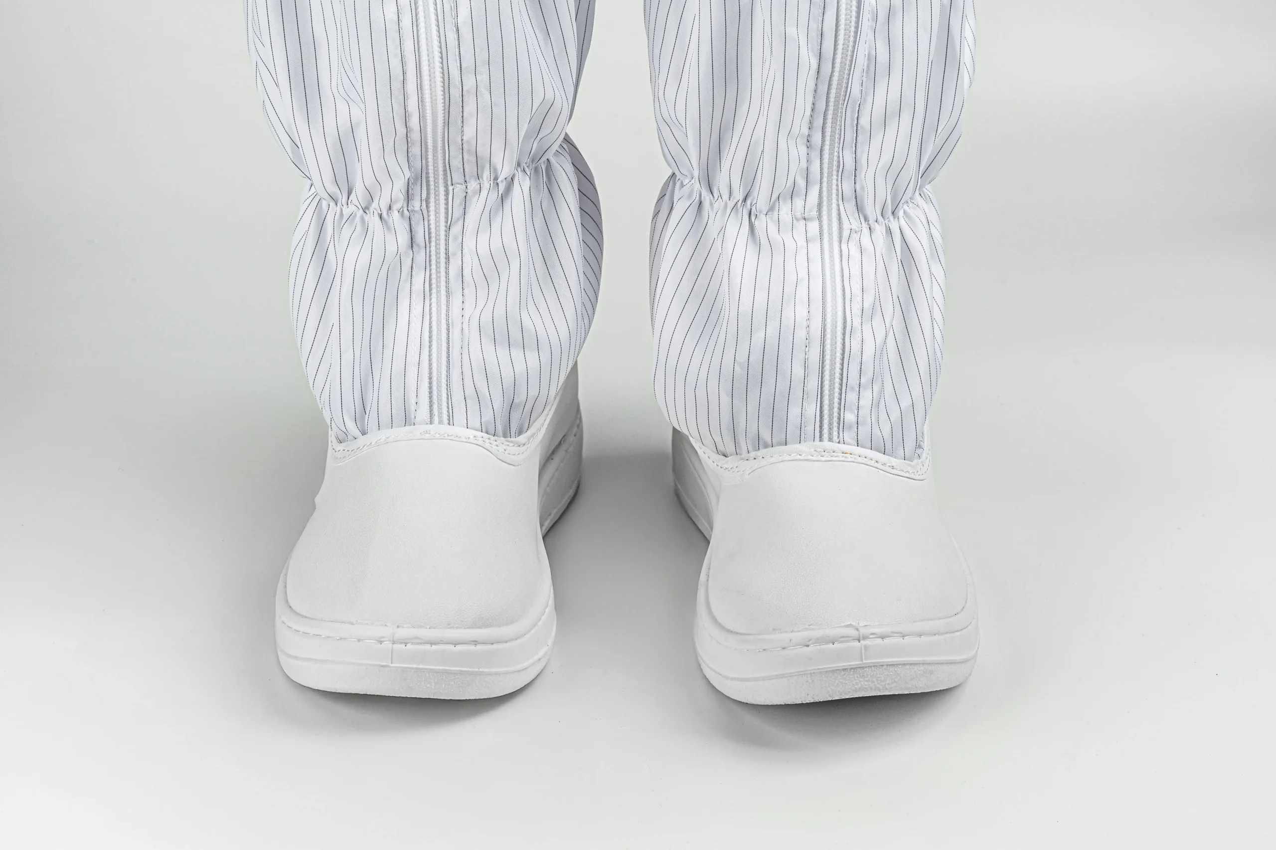 These boots are crafted with a durable PVC front sole seamlessly joined with anti-static fabric to ensure secure bonding and flexibility. A front zipper allows for easy wear and removal, while a secure locking system prevents accidental opening during movement. The high tube design offers enhanced coverage and support for high-standard cleanroom work.