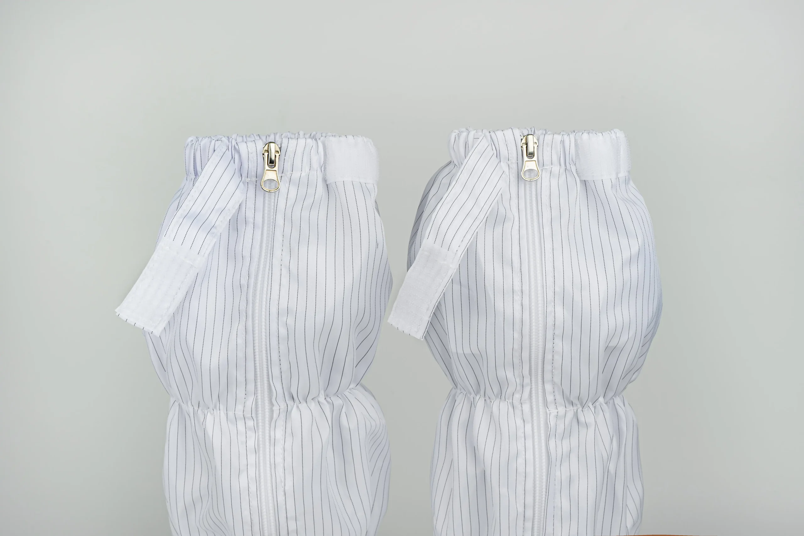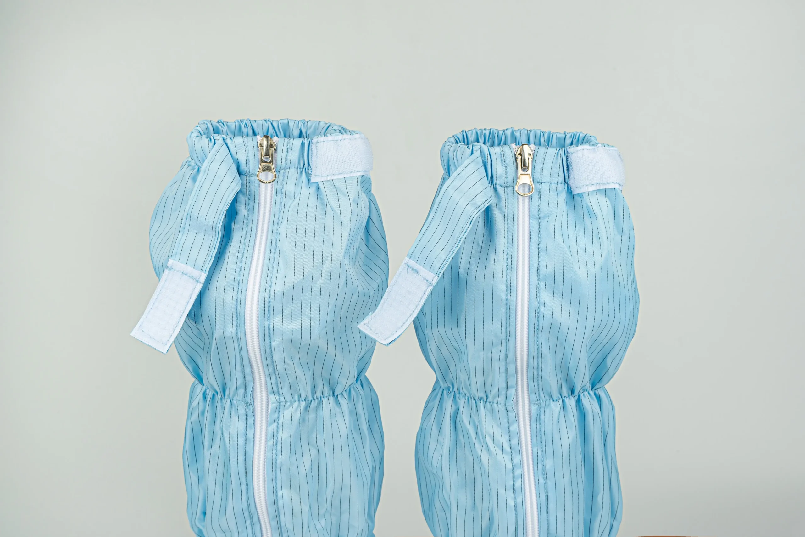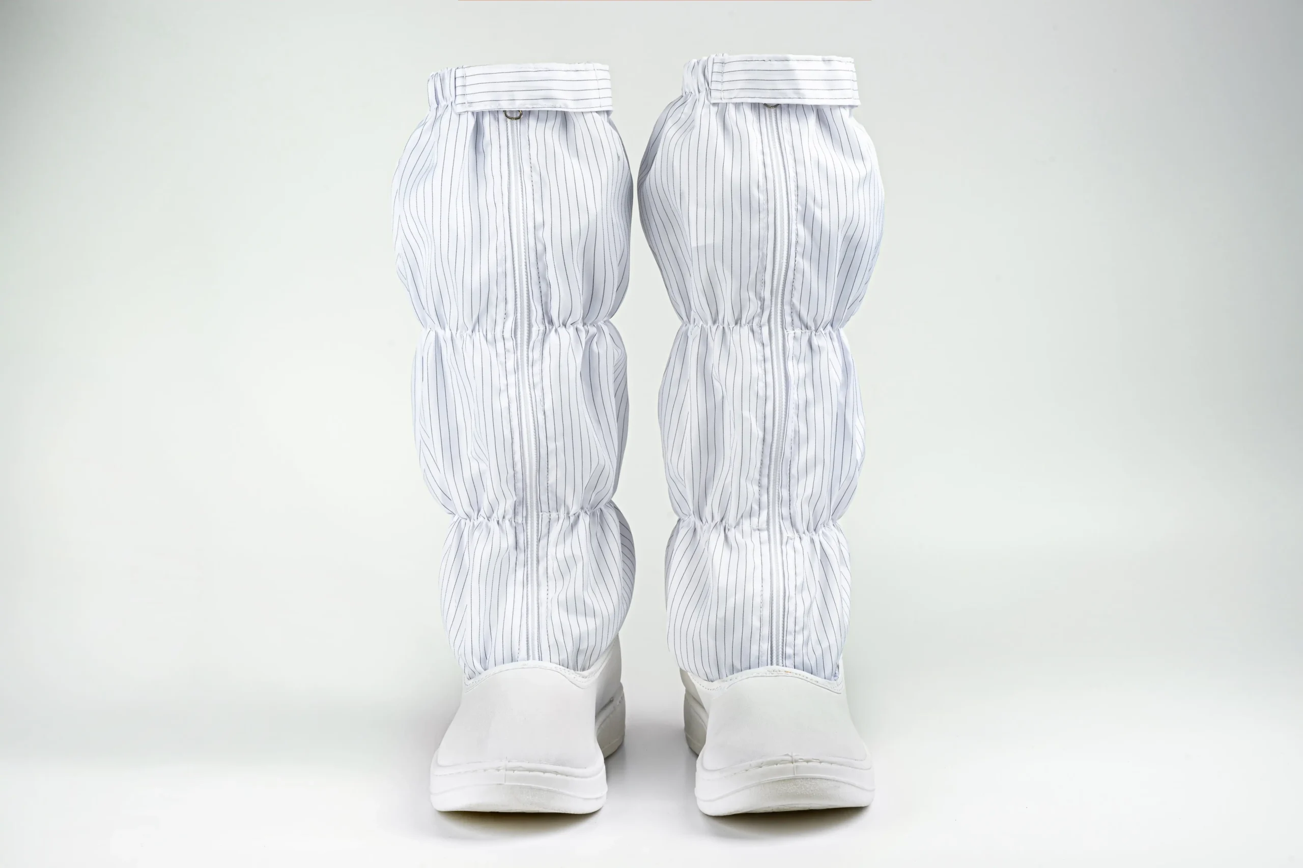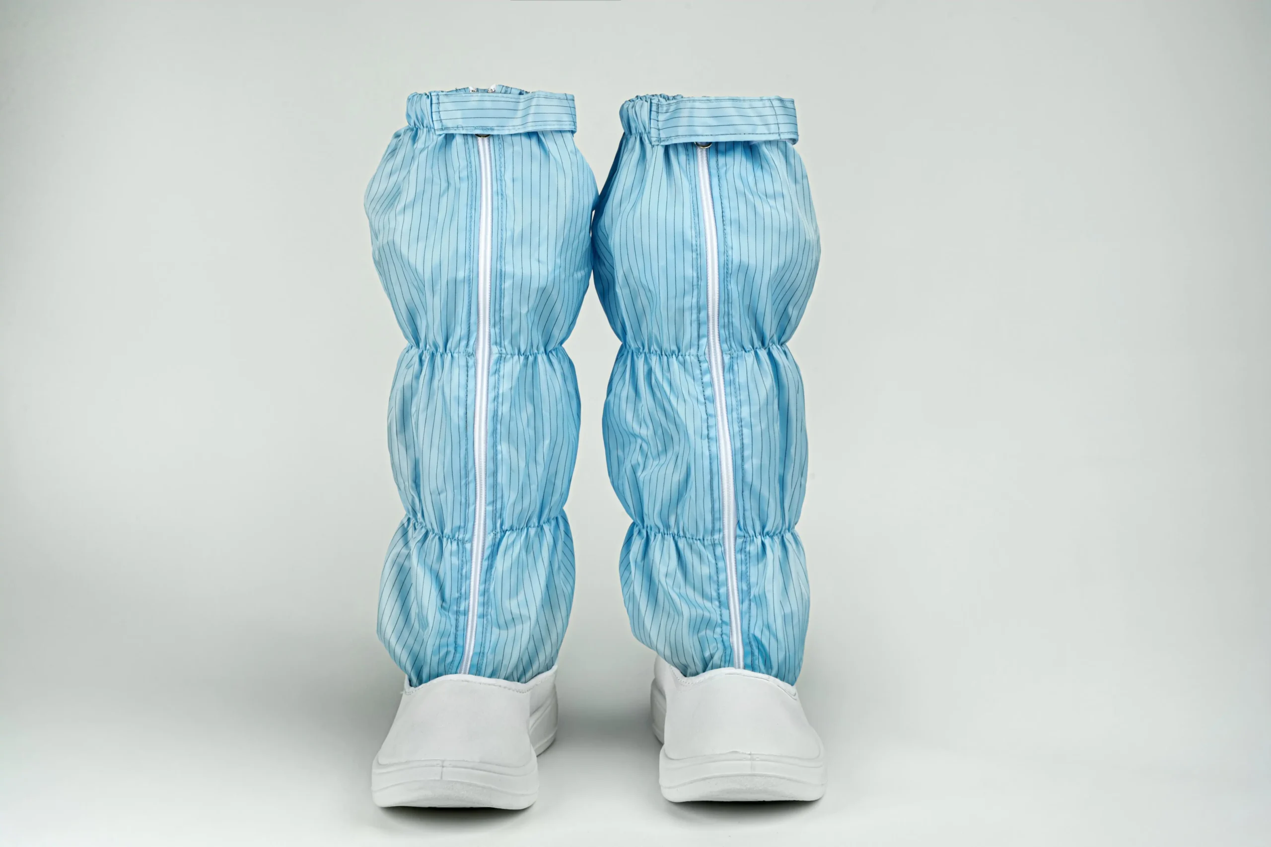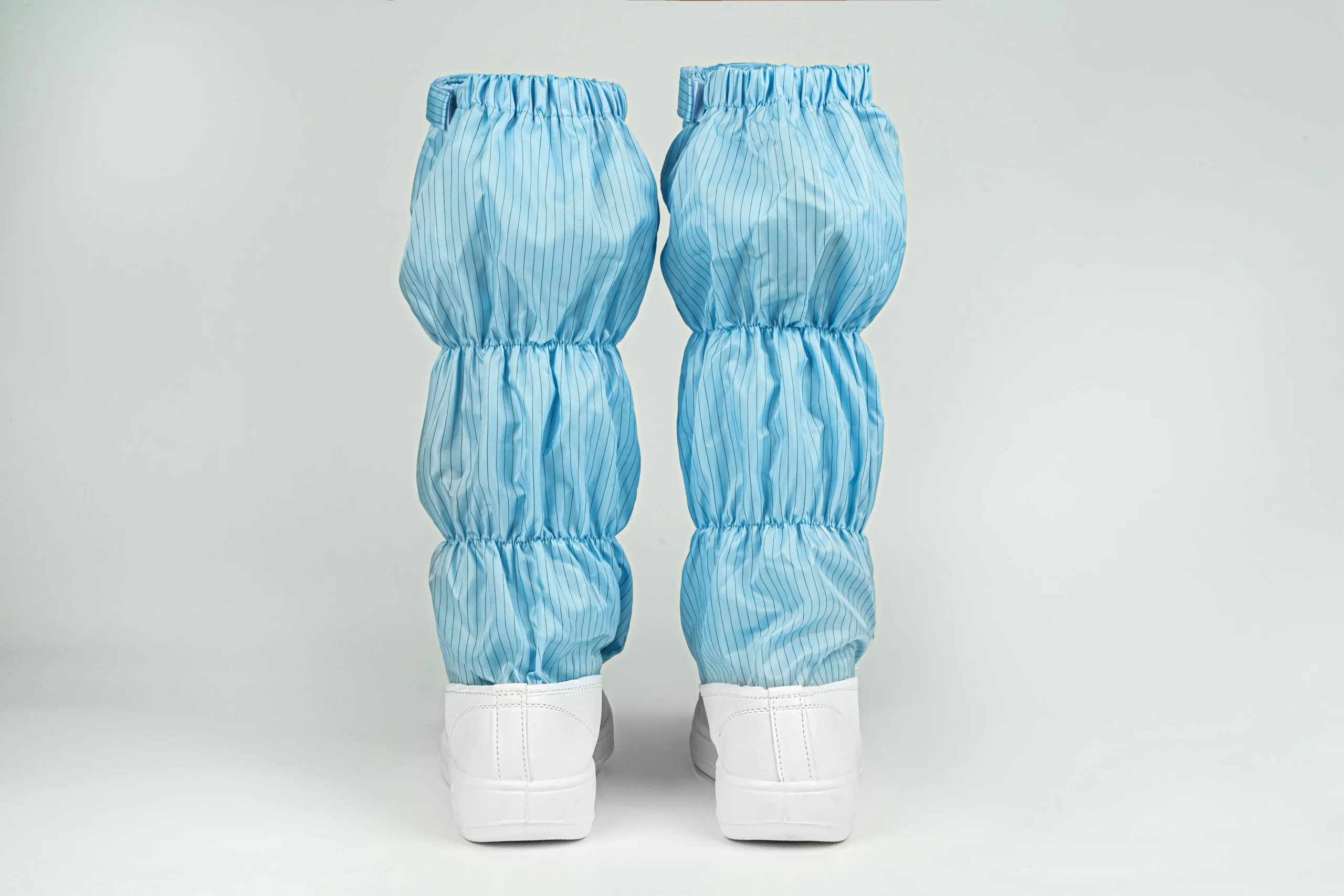 These anti-static boots provide reliable static control and full lower-leg protection in cleanroom settings. Made with conductive striped fabric and elastic bands, they fit securely up to just below the knee. A front zipper with flap offers easy wear and a tight seal. The durable PVC sole and reinforced polyester shaft ensure excellent ESD performance and dust control, perfectly complementing cleanroom apparel.