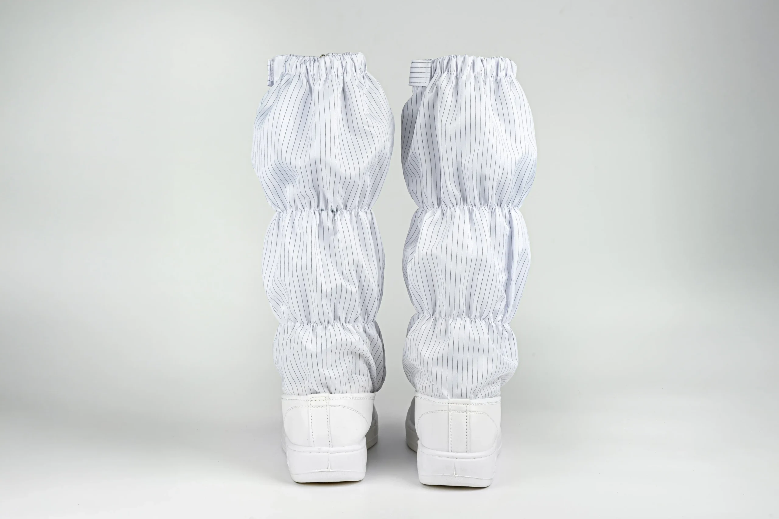 Made with anti-static striped fabric, these boots extend up to just below the knee for added protection. The shaft includes conductive fibers and multiple elastic bands for a secure fit. A front zipper with a locking flap makes them easy to wear while staying firmly closed. The non-slip PVC sole is tightly bonded to the upper for durability and flexibility in cleanroom use.