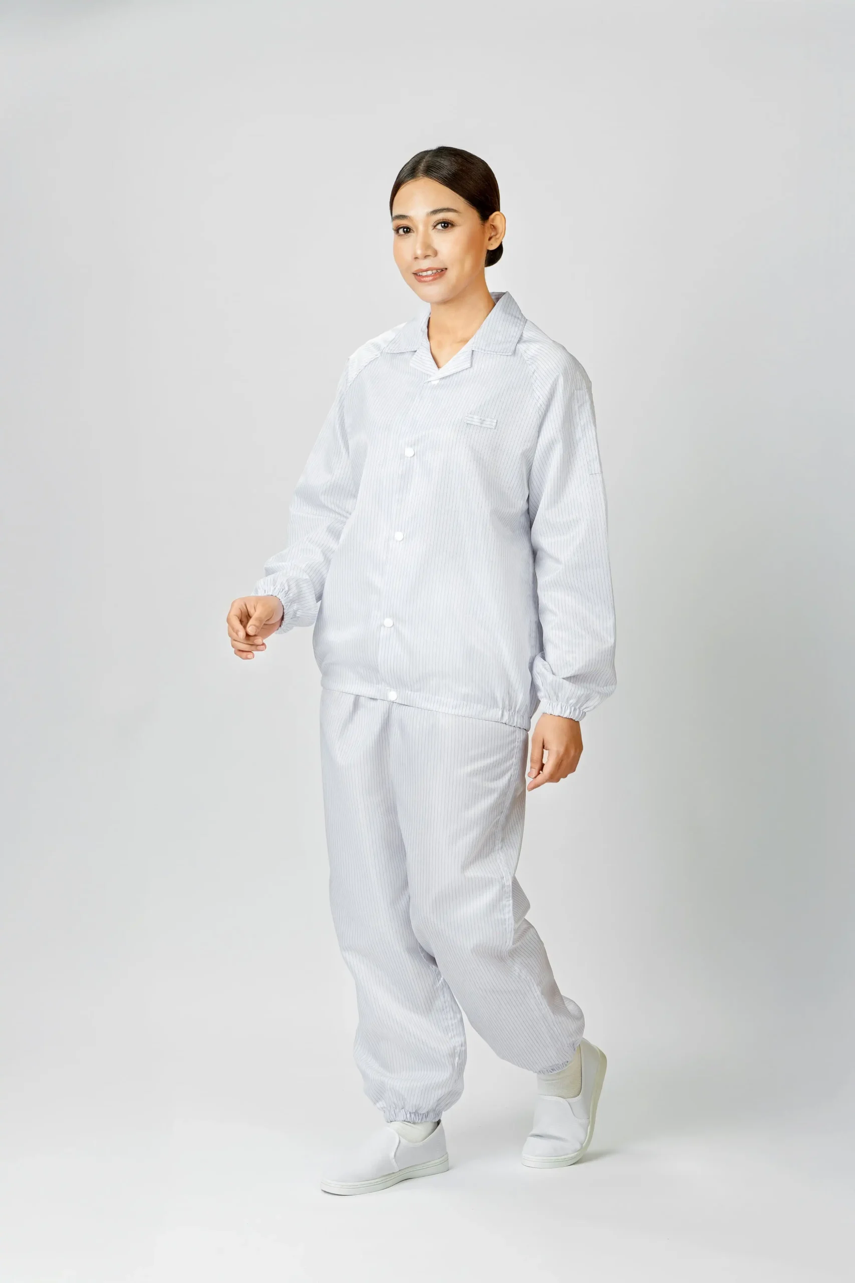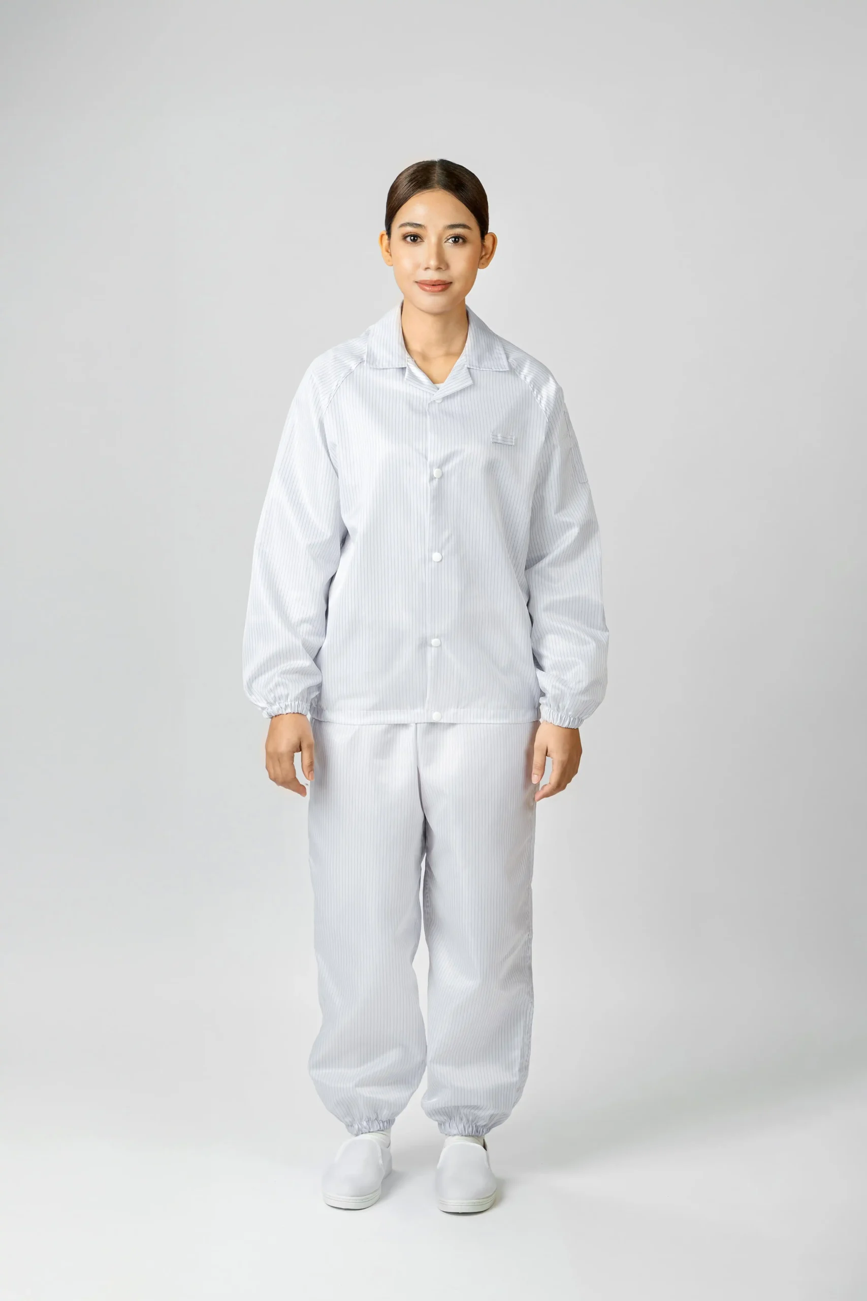 The jacket features a neat collar and button front, a handy pen slot on the chest, and a practical sleeve pocket on the arm for extra storage. Elastic at the waist and cuffs keeps it comfortable and secure during cleanroom work.